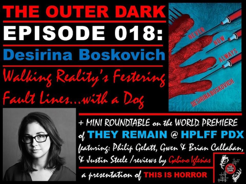 In this podcast Scott Nicolay interviews Desirina Boskovich, author of Never Now Always. Also a mini-roundtable preview of the HP Lovecraft Film Festival & CthulhuCon (Oct. 6-8, Portland, OR) featuring Philip Gelatt (They Remain World Premiere), Gwen and Brian Callahan, and Justin Steele, plus reviews by Gabino Iglesias (LitReactor, Zero Saints) of They Remain and Desirina’s Never Now Always.