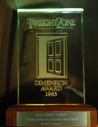 The Twilight Zone Dimension Award 1985, awarded to David J. Schow for Coming Soon to a Theater Near You.
