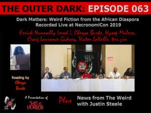 In this podcast The Outer Dark presents a reading by Chesya Burke and ‘Dark Matters: Weird Fiction from the African Diaspora’ Panel at NecronomiCon 2019 moderated by Errick Nunnally and featuring Chesya Burke, Craig Laurance Gidney, Victor LaValle, Hysop Mulero, and teri.zin, plus News from The Weird with Justin Steele. The panel was recorded live …