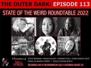 The Outer Dark presents State of The Weird Roundtable 2022 featuring Steve Berman, Nadia Bulkin, Gemma Files, Fiona Maeve Geist, Craig Laurance Gidney, and Nicole Givens Kurtz. This podcast’s content was moderated by Anya Martin and recorded at NecronomiCon in Providence, Rhode Island, on August 20, 2022. Show Notes The Outer Dark presents State of …