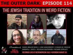 The Outer Dark presents ‘The Jewish Tradition in Weird Fiction’ panel at NecronomiCon 2022 featuring Daniel Braum (moderator), Edward M. Erdelac, Richard Gerlach, Maxwell I. Gold, Nicholas Kaufmann, and Ann VanderMeer. This podcast’s content was recorded in Providence, Rhode Island, on August 20, 2022. Show Notes The Outer Dark presents ‘The Jewish Tradition in Weird …