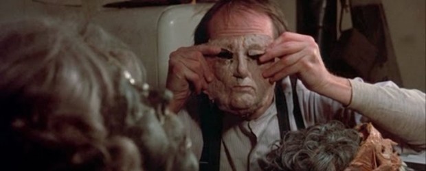 Deranged skin maskThe funeral service proceeds over Amanda’s open coffin with only Ezra and his neighbours Harlan and Jenny Kootz in attendance. Harlan tells him she’s only sleeping, and Ez agrees, believing it. We see Ez taking dinner with the Kootzes, who try to do their best for this eccentric, friendless soul. After a year Ezra’s loneliness becomes too much. He holds conversations with his mother, answering in her voice, and then takes the next step – to liberate her from the grave and bring her back home.