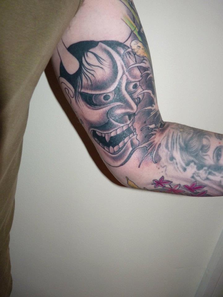 Some of my early ones had skulls, but they’ve been covered over now, although I still have some skulls on my back, and I guess skulls have always been associated with horror. But I guess the only other one that is synonymous with horror is my latest one, which was started yesterday as part of my Japanese sleeve, of a Hannya mask, which represents a woman who has been betrayed by love and is filled with rage, jealousy and hatred and has become a demon.