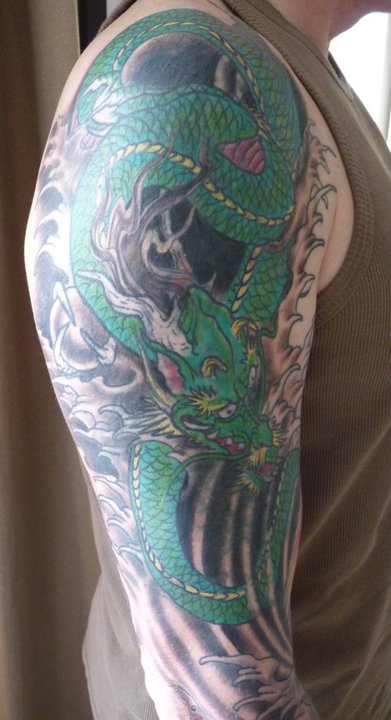 I don’t have any that relate directly to my fiction, but when my novel, The Kult was filmed I decided to celebrate this landmark by having my sleeves done, which was something that I’d wanted for a while, so it was as good an excuse as any. It had been a number of years since I’d had a tattoo, and I had work on my arms already, but it was unrelated so I knew it wasn’t going to be an easy task to cover them over, which is why I went to a tattoo artist I knew I could trust to do a great job, Kev Shercliff from Midlands Tattoo Centre. Kev had done the dragon on my shoulder, the woman’s face on my forearm, and pieces on my chest and back, but this was over twenty-six years ago. But Kev’s an award winning artist and his work has stood the test of time, so I knew he was the one I wanted to do the work. The only piece that has survived on my arm is a woman’s face as it was my favourite piece.