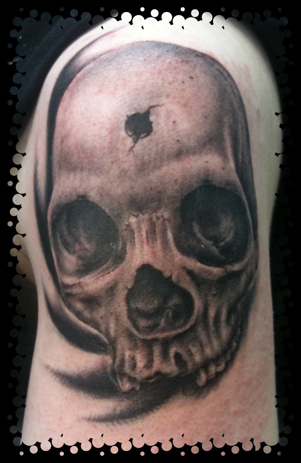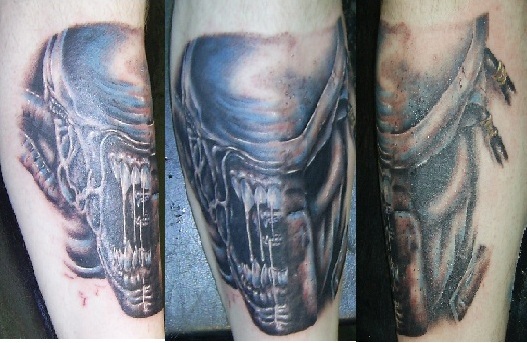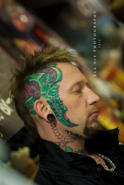 I tattoo a lot of horror imagery on others such as gory zombies and movie stills from films like Evil Dead, 30 Days of Night, Alien etc. Of my own collection I have a lot of skull-based tattoos and my head/facial tattoo done by Gerry Carnelly of Octopus Tattoo, is a mixture of bio-organic shapes with various body parts like a brain and teeth.