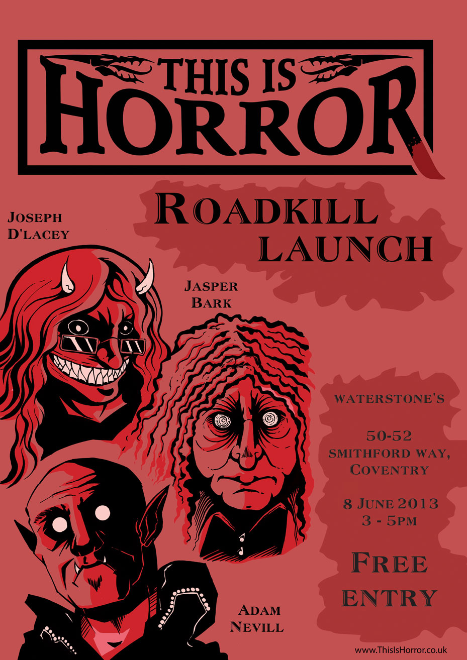 Saturday June 8, 2013 sees the launch of the fourth This Is Horror chapbook, Roadkill by Joseph D’Lacey. To celebrate what will mark the final This Is Horror chapbook for year one we are putting on a very special event at Waterstone’s in Coventry with Joseph D’Lacey, Adam Nevill and Jasper Bark.