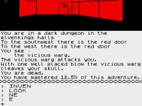 A classic example of this is 1982’s The Hobbit on the ZX Spectrum. The game became renowned for being impossibly difficult, but what set it apart from its peers was the descriptive language used, particularly to describe its monsters. A scene which stays in the mind is, just at the edge of Hobbiton, where the player enters a forest and among the dark, barren trees your character sees pale, bulbous eyes. The fear factor here was magnified when any action you chose ended with a swift death from above. Another But perhaps the most harrowing memory for players of The Hobbit was mistiming or directing an attack and reading the fateful words “with one vicious blow, he cleaves your skull. You are dead.”