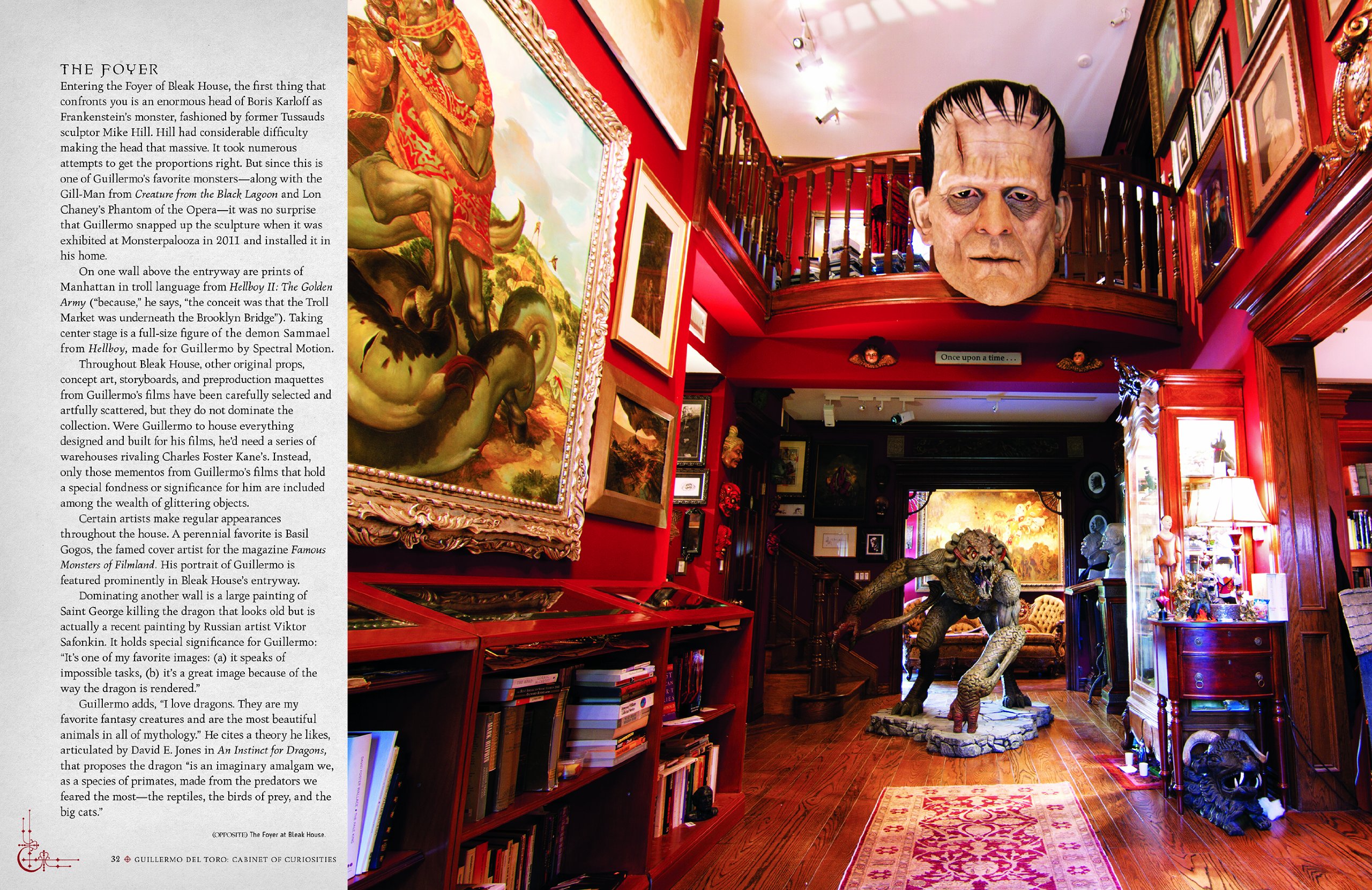 Fortunately, del Toro has us covered. Cabinet of Curiosities: My Notebooks, Collections, and Other Obsessions reveals the method to the man’s madness. As a fan of the genre, del Toro takes us on a brief tour of his early inspirations such as Arthur Machen, Mary Shelley, Lovecraft, and Poe. He takes us on a tour of his home, which is basically a shrine of horror memorabilia with waxworks and movie props, Giger prints and recreations of some of horror’s greatest film scenes. We see who influenced him with art and filmmaking, and get a chance to read what his peers think of him.