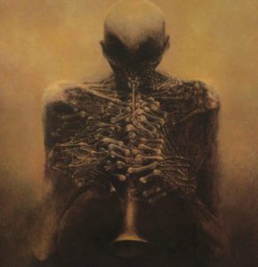 I found his art late in my life, after he died as a matter of fact, from the cover of the B&N edition of H.P. Lovecraft’s At the Mountains of Madness and Other Weird Tales. ‘The Trumpeter’ as it’s often called, is very fitting for that particular edition; face hidden in shadow, many fingered hands holding the notes for an evil melody. A quick internet search for Beksiński lead me down a deep and dark rabbit hole that hit all the right nerves. A painter inspired by music inspiring my fiction, what else could anyone ask for?