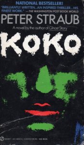 Koko coverI came by Peter Straub’s Koko first by mass market paperback. I remember distinctly not reading it when it first released in 1988, mainly because I was a junior in college and my studies and a steady girlfriend kept me wrapped up tight. I was in love and behind the eight-ball, so I couldn’t be bothered with reading. All good things come to an end and when the paperback hit the shelves, I bought it and eagerly began reading it.