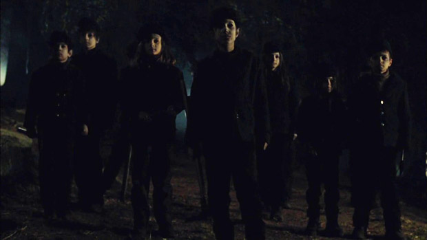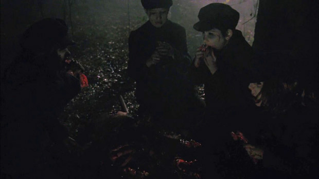 See, for example, the mind-bogglingly dumb scene involving a trio of teens attempting to get a car unstuck from the mud. As one of their number lifts and pushes from the rear, the others inside crank the gas in order to get it moving. Unbeknownst to our ill-fated friend at the rear of the car, one of the zombie children climbs onto the bonnet, walks up the windshield, across the top of the car, and plants a mining utensil in his back.