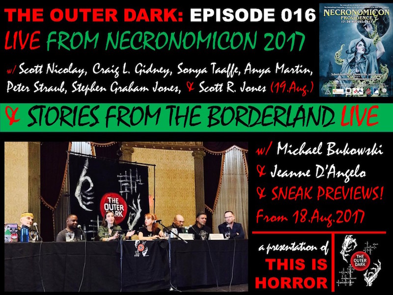 In this podcast The Outer Dark presents a program featuring Craig Laurance Gidney, Scott R. Jones, Stephen Graham Jones, Peter Straub and Sonya Taaffe. It was hosted by Scott Nicolay, moderated by Anya Martin and recorded at NecronomiCon 2017 before a live audience. This jam-packed episode also features a NecronomiCon report with Justin Steele and Anya Martin, as well as “Stories from the Borderland Live!: Bringing the Stories Back Alive: Expanding and Illustrating the Canon of The Weird” with artists Michael Bukowski and Jeanne D’Angelo. These presentations were recorded live on Saturday August 19 and Friday August 18, 2017.