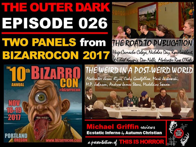 In this podcast The Outer Dark presents two panels from BizarroCon 2017 (Nov 17-19, Portland, OR): ‘The Road to Publication’ featuring Ross Lockhart, Hugo Camacho Cabeza, Don Noble and Nicholas Day, Michael Kazepis, and Rose O’Keefe (moderator) and ‘The Weird in a Post-Weird World’ featuring Cody Goodfellow, Mark Jaskowski, Emma/MP Johnson, Andrew James Stone, Madeleine Swann, and Jason Rizos (moderator). The show opens with the official announcement of the second annual The Outer Dark Symposium (March 24, 2018) and also includes a BizarroCon report, News from the Weird and a review of Ecstatic Inferno by Autumn Christian with guest co-host Michael Griffin The panels were recorded live on Sunday November 19.