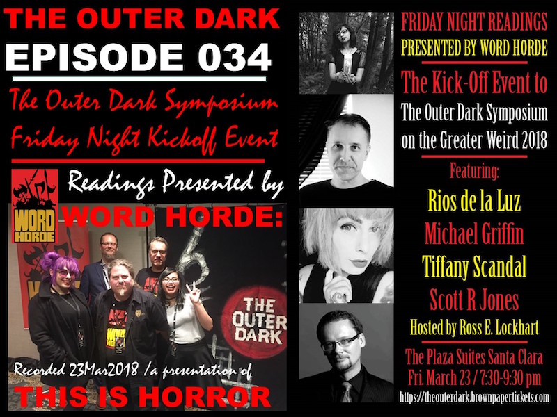 In this podcast The Outer Dark Symposium on the Greater Weird 2018 kicks off with Friday Night Readings Presented by Word Horde featuring Rios de la Luz, Michael Griffin, Scott R Jones, and Tiffany Scandal. This episode was recorded live on Friday March 23, 2018 at The Plaza Suites Santa Clara. The podcast also includes an introductory interview with Word Horde Publisher/Editor Ross E. Lockhart.