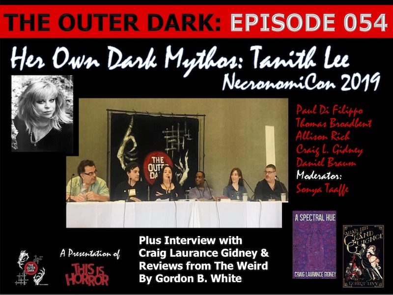 In this podcast The Outer Dark presents Her Own Dark Mythos: Tanith Lee Panel at NecronomiCon 2019 moderated by Sonya Taaffe and featuring Craig Laurance Gidney, Paul Di Filippo, Allison Rich, Thomas Broadbent, and Daniel Braum, plus an introductory interview with Craig Laurance Gidney and the debut of new feature Reviews from The Weird with Gordon B. White. Her Own Dark Mythos: Tanith Lee was recorded live on Friday August 23, 2019, and the Introduction and Reviews from the Weird were recorded Sunday September 22, 2019.