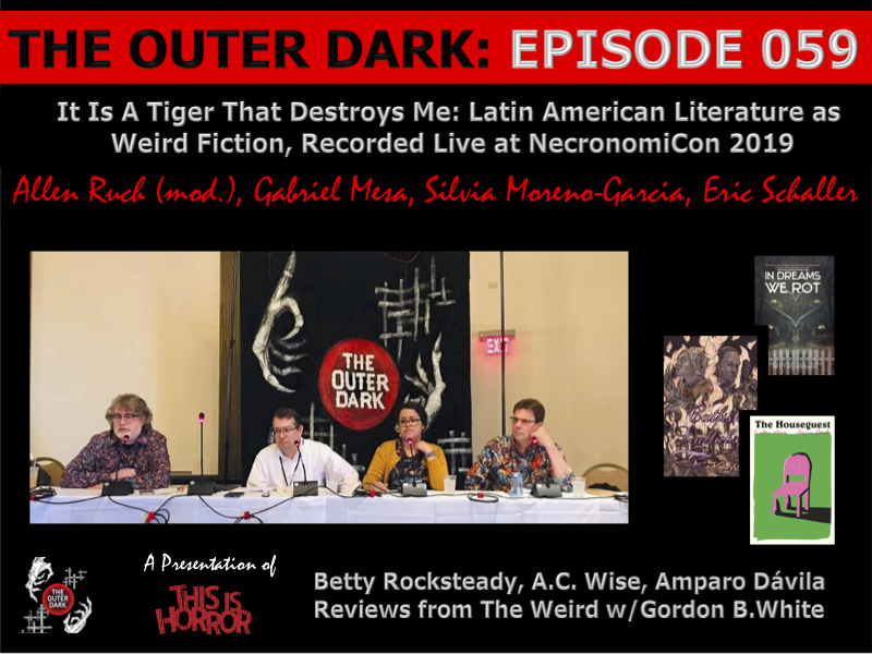 In this podcast The Outer Dark presents ‘This Is a Tiger That Destroys Me’ Panel at NecronomiCon 2019 moderated by Allen B. Ruch and featuring  Eric Schaller, Gabriel Mesa, and Silvia Moreno-Garcia, plus Reviews from The Weird with Gordon B. White including In Dreams We Rot by Betty Rocksteady (Trepidatio), Catfish Lullaby by A.C. Wise (Broken Eye Books), and The Houseguest and Other Stories by Amparo Dávila (New Directions). The panel was recorded live on Saturday August 24, 2019, and Reviews from The Weird was recorded Thursday October 22, 2019.