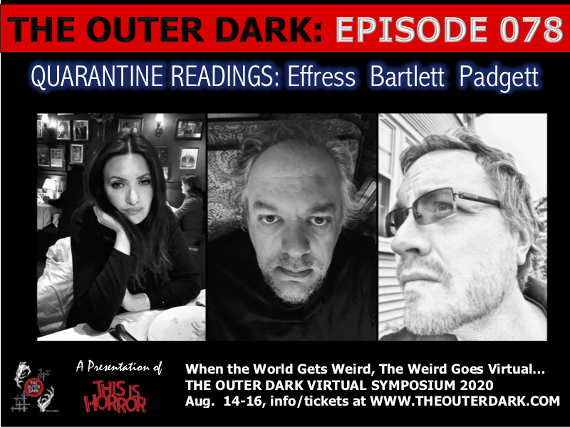 In this podcast The Outer Dark presents Quarantine Readings by Inna Effress, Matthew M. Bartlett, and Jon Padgett. The interviews were recorded on Sunday July 19 and Monday July 20, 2020.