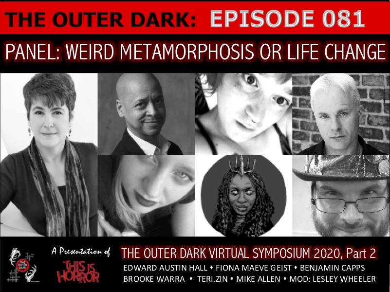 In this podcast, The Outer Dark Virtual Symposium 2020 continues with Weird Metamorphosis or Life Change: Where the Body Becomes the Setting, the weekend’s first panel moderated by Lesley Wheeler and featuring Mike Allen, Benjamin Capps, Fiona Maeve Geist, Edward Austin Hall, Brooke Warra, and teri.zin. PLUS Mike Allen reads and Lesley Wheeler and featuring Mike Allen, Benjamin Capps, Fiona Maeve Geist, Edward Austin Hall, Brooke Warra, and teri.zin. PLUS Mike Allen reads, and Brian Hauser interviews filmmakers Benjamin Capps, Izzy Lee, and Stacey Palmer. This programming took place on Friday August 14, 2020.