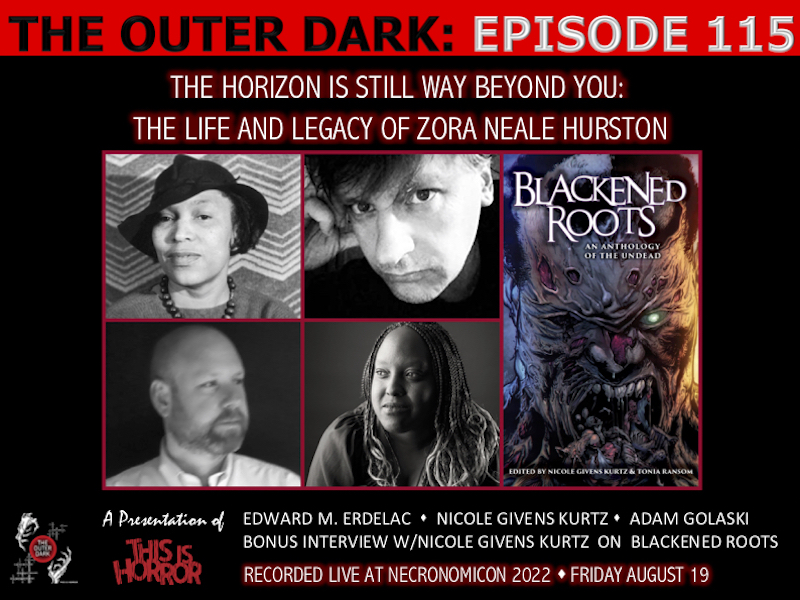 The Outer Dark presents ‘The Horizon is Still Way Beyond You: Zora Neale Hurston’s Life and Legacy’ panel at NecronomiCon 2022 featuring Edward M. Erdelac (moderator), Nicole Givens Kurtz, and Adam Golaski plus a bonus interview with Nicole Givens Kurtz about Blackened Roots: An Anthology of the Undead (February 2023, Mocha Memoirs Press). This podcast’s content was recorded in Providence, Rhode Island, on August 19, 2022.