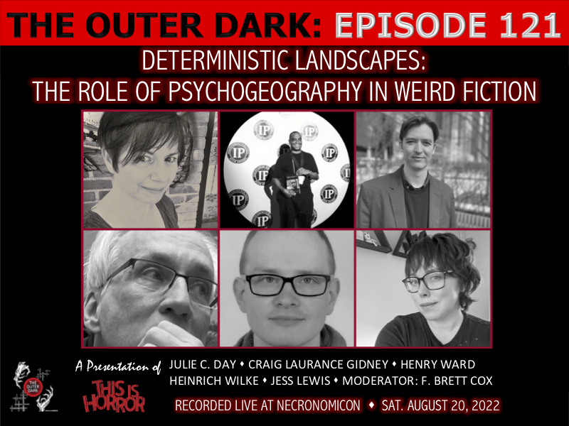 The Outer Dark presents “Deterministic Landscapes: The Role of Psychogeography in Weird Fiction” a NecronomiCon 2022 panel moderated by F. Brett Cox and featuring Julie C. Day, Craig Laurance Gidney, Jess Lewis, Henry Ward, and Heinrich Wilke. In literary criticism, psychogeography explores how the physical environment impacts the mind and behavior of the individual. The claustrophobic density of the city, the homogeneity of suburban developments, the vast isolation of the deep woods, Antarctic ice, or open ocean. What horrors emerge when we make a wrong turn or enter an unfamiliar environment? What madness follows when we attempt to exist in places not meant for human occupation? Our panelists discuss the role of place as a driver of psychology and narrative in Weird film and literature. Be sure and scroll down to the Additional Links for reading and viewing recommendations! Thank you to Niels Hobbs, K.H. Vaughan, Catherine Grant, and all the fabulous NecronomiCon 2022 team for allowing us to air this podcast’s content, which was recorded in Providence, RI, on August 20, 2022.